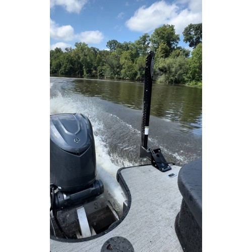 Braced universal adapter plate for Power-Pole anchors. Great for mounting on the back of a pontoon boat when you can't use the normal deck mount without getting backwash.